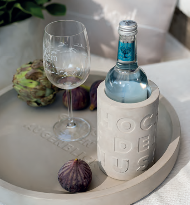 Beton Kühle Betonoptik gepaart mit warmen Worten sorgt für die passende Dekoration im In- und Outdoorbereich. Die Flaschenkühler aus Beton halten nicht nur Wein angenehm kalt, sondern auch Sekt und Wasser. Durch ihr besonderes Material kühlen sie lange, nachdem sie mit kaltem Wasser getränkt wurden. Für Genießer und Gourmets, Weinliebhaber und leidenschaftliche Kellermeister. Zum Material: Beton mit Relief und Prägung LIVING – Lifestyle- und Wohnaccessoires von Räder Gestalte Dein alltägliches Leben neu und bereichere Dein Zuhause mit den einzigartigen Wohnaccessoires von Räder Design LIVING! Hier findest Du detailverliebte Designs, die das Wohnen in Deinen vier Wänden mit Ästhetik erfüllen. Zum Beispiel Lichtobjekte wie die populären Räder-Lichthäuser, Porzellanvasen und Glasvasen oder exklusive Wanddeko von Räder Design. Schmücke Dein Zuhause mit Fensterdeko, mach's Dir gemütlich mit Decken und Kissen oder gönn Dir etwas Entspannung mit Duftkerzen, Lichtgläsern und weiteren Badartikeln von Räder!