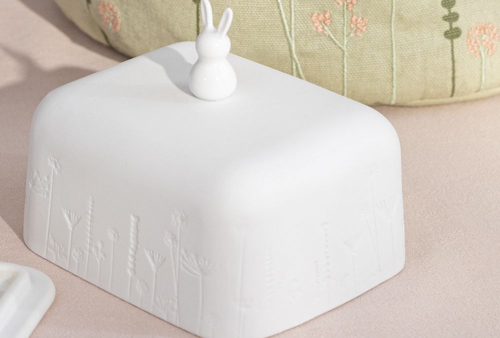 Die „Osterwiese“ Butterdose aus Porzellan von Räder Design begeistert mit einem 3D-Hasen auf dem Deckel und liebevollen Osterwiese-Prägungen außen. Mit einem farbigen Decal innen ist sie eine frühlingshafte Dekoration für den Tisch oder die Küche. Perfekt für Ostern oder als stilvolle Geschenkidee.