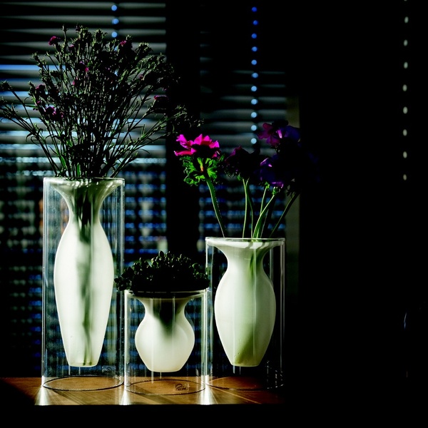 Diese Vase ist nicht nur eine Vase, sie ist noch mehr: ein Design - Objekt. Schwebt die eigentliche Blumenvase in einer Glasröhre. Durch die Gegensätze des matten und trasparenten Glases tritt diese Wirkung um so deutlicher hervor. Die Esmeralda Vasen sind elegant in ihrer Form und in 3 verschieden Größen erhältlich. Philippi Design
