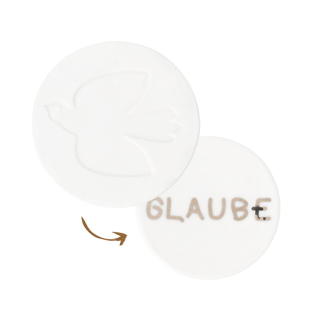 Design trifft Tiefgang: Dieser feine Taler aus unglasiertem Porzellan ist beidseitig gestaltet: Auf der Vorderseite prangt eine filigrane Taube, während die Rückseite mit dem goldenen Schriftzug "Glaube" veredelt ist. Der Taler wird in einem hochwertigen Baumwollsäckchen geliefert, das mit dem bestärkenden Wunsch "Der Glaube soll dich stärken" bedruckt ist.