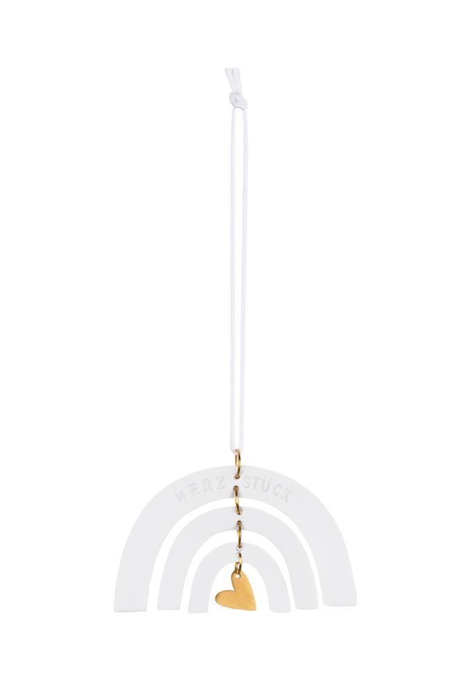 Ein kleiner Regenbogen für Zuhause. Er lässt sich an Sträucher hängen oder wo auch immer man ihn hängen sehen will. Der Regenbogen besteht aus Porzellan und ist an einem Baumwollband befestigt. Das kleine goldene Herzelement ist aus mattem Metall. Auch als kleine Aufmerksamkeit für einen lieben Menschen, ist der kleine Regenbogen eine süße Überraschung.